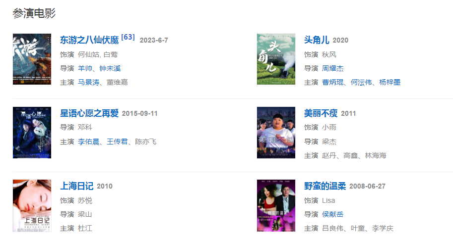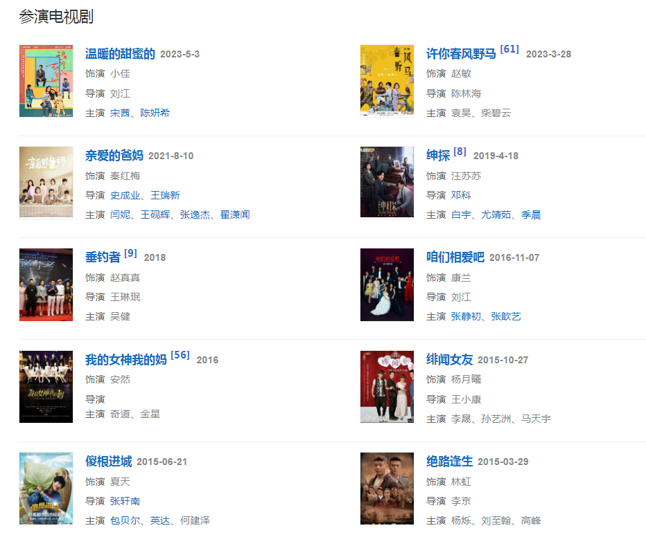 代表作品:星語心愿之再愛、婆婆來了、中國刑警803、咱們相愛吧、野鴿子