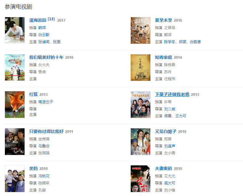 2016年,與任程偉主演反映知青家庭生活、富二代教育題材的電視劇《知青家庭》 。