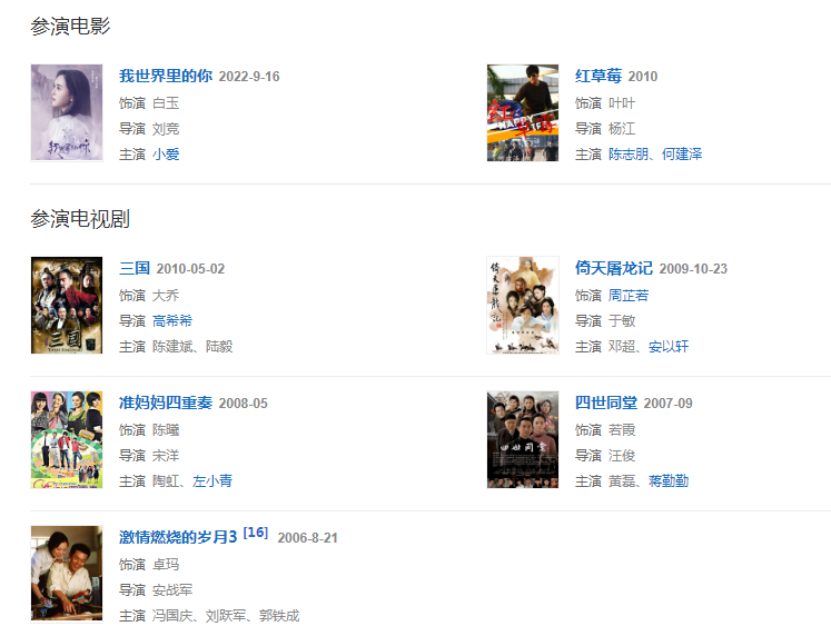 2009年,出演古裝劇《三國》飾演大喬;同年,她因在古裝武俠劇《倚天屠龍記》中飾演周芷若而獲得更多關(guān)注。