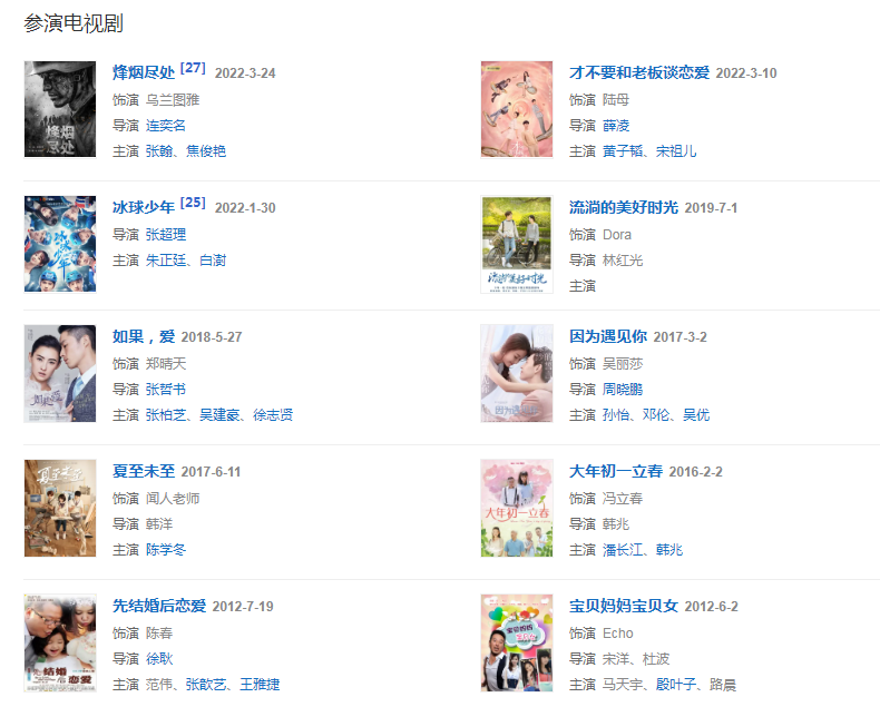 2022130日,參演的體育競(jìng)技劇《冰球少年》播出  ;310日,友情主演的都市奇幻愛情劇《才不要和老板談戀愛》播出;324日,參演抗戰(zhàn)劇《烽煙盡處》,飾演男主的母親烏蘭圖雅。