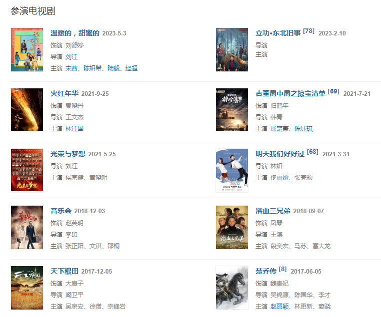 代表作品:金粉世家、京華煙云、老大的幸福、火線三兄弟、大連故事、風(fēng)雨、楚喬傳 、