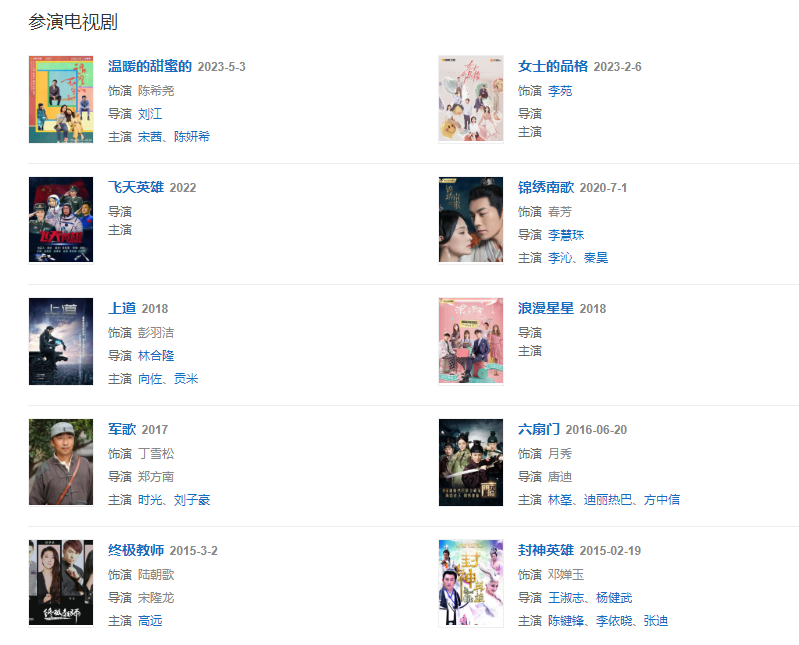 代表作品:女人花、回家的誘惑、百萬(wàn)新娘之愛(ài)無(wú)悔、太平公主秘史、武媚娘傳奇、活佛濟(jì)公、隋唐英雄