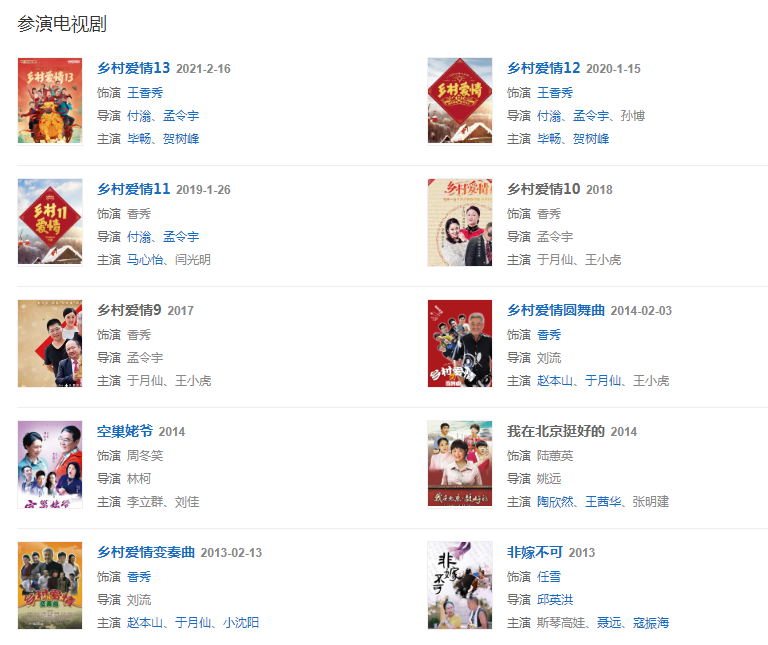 2014年2月,主演的《鄉(xiāng)村愛情》系列劇第七部《鄉(xiāng)村愛情圓舞曲》在天津衛(wèi)視播出,在劇中飾演“香秀”一角 。