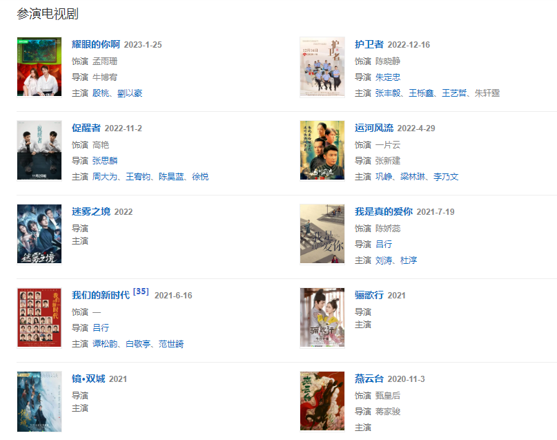 代表作品:戰(zhàn)旗、女人的顏色、兵臨城下、秀麗江山之長歌行、戰(zhàn)火紅顏、延禧攻略、灣區(qū)兒女