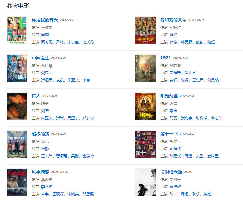 2021年4月9日,主演電影《超級的我》定檔上映;4月11日,與佟大為、蔣欣聯(lián)合主演電視劇《小舍得》開播,在劇中飾演事業(yè)有成、兒女雙全的媽媽南儷;5月1日,領街主演喜劇犯罪片《陽光劫匪》定檔上映;6月5日,主演的愛情電影《詩人》上映;7月1日,主演的電影《1921》上映,在片中飾演高君曼;7月1日,參加的慶祝中國共產(chǎn)黨成立100周年文藝演出《偉大征程》播出,表演戲劇《跨越》。7月9日,參演的電影《中國醫(yī)生》上映 ;9月15日,擔任總制片人的互動電影《如果有當初》在愛奇藝電影播出;10月1日,主演的電影《我和我的父輩》之《鴨先知》上映。