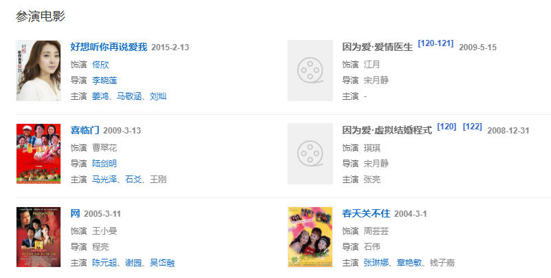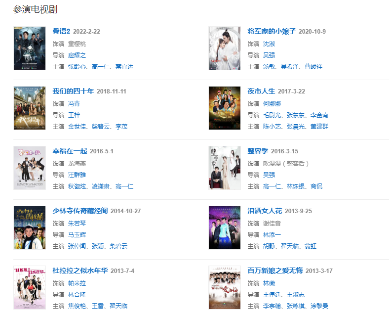代表作品:紅蘋(píng)果樂(lè)園、真愛(ài)之百萬(wàn)新娘、活佛濟(jì)公、單身公主相親記、回家的誘惑、我的燦爛人生、薛平貴與王寶釧、杜拉拉之似水年華、淚灑女人花、少林寺傳奇藏經(jīng)閣