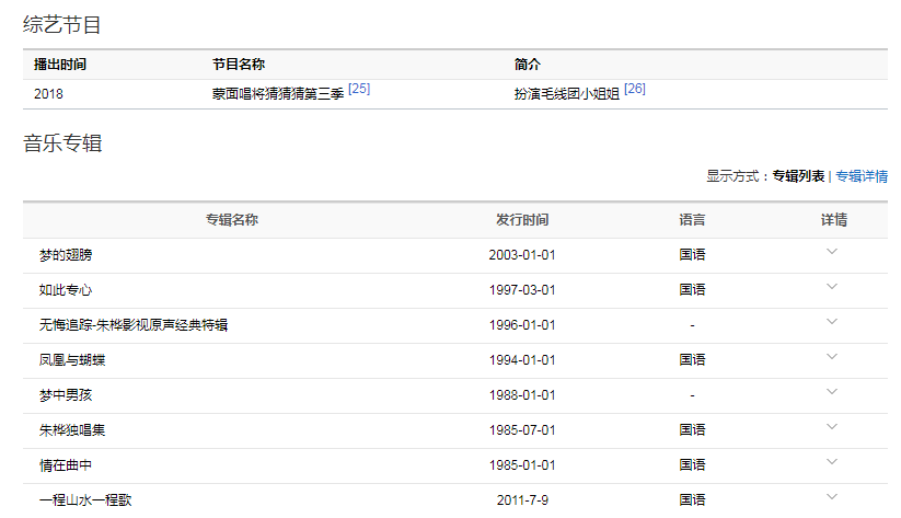 1985年發(fā)行首張專輯《情在曲中》。1991年,參與中國唱片總公司突破720萬張銷量的《紅太陽1-5輯》錄制。其中1994年出版的的《鳳凰與蝴蝶》專輯獲得好評。2003年單曲《咔》獲得中國歌曲排行榜十五大金曲。2004年《歌聲魅影》中文版被Andrew Webber選為美國電影《歌劇魅影》亞洲區(qū)推廣歌曲。2009年朱樺發(fā)布全新單曲《妮妮》2010年,赴美國紐約參加《中美手拉手電視晚會》,在曼哈頓中心劇院與Grammy三項得主Harry Connick Jr.合唱《在那遙遠的地方》,并與費翔現(xiàn)場合作《歌聲魅影》。同年的上海世博會,朱樺同Harry Connick Jr.在美國館再次唱響這首歌曲。同年朱樺發(fā)行以人與狗狗情感為主線的歌曲《妮妮》。