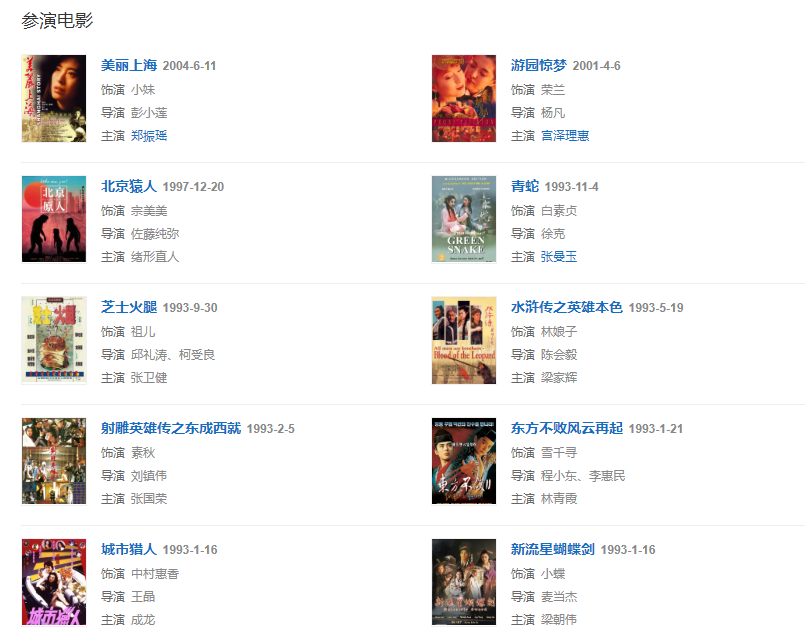 代表作品:倩女幽魂、青蛇、美麗上海、游園驚夢(mèng)、東方不敗風(fēng)云再起、賭神