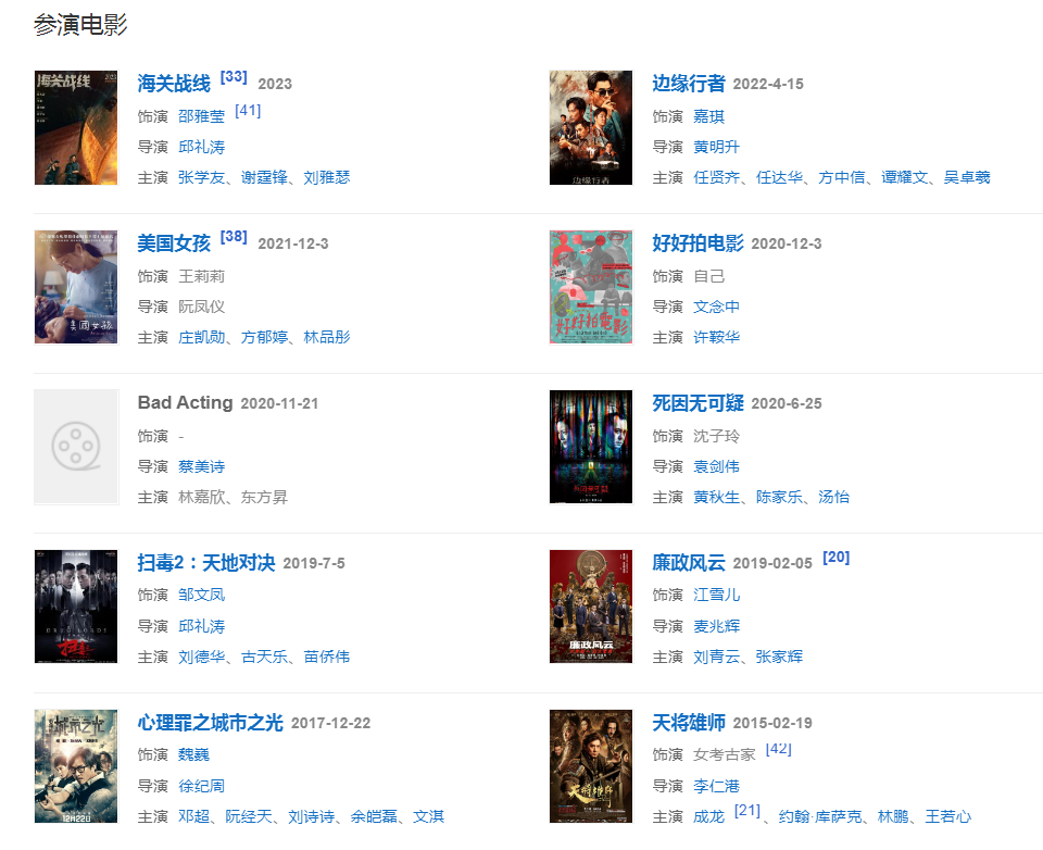 2022年4月6日,由林嘉欣等主演的電影《海關(guān)戰(zhàn)線》開機。4月15日,參演的犯罪動作電影《邊緣行者》上映。