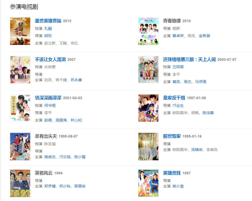 代表作品:情深深雨濛濛、還珠格格第三部:天上人間、愛與誠(chéng)、愛得太遲、好想好想、告別我的戀人們、戀無(wú)可戀、忘了時(shí)間的鐘、必殺技、歡樂(lè)今宵、找到你是我最偉大的成功、情歌王