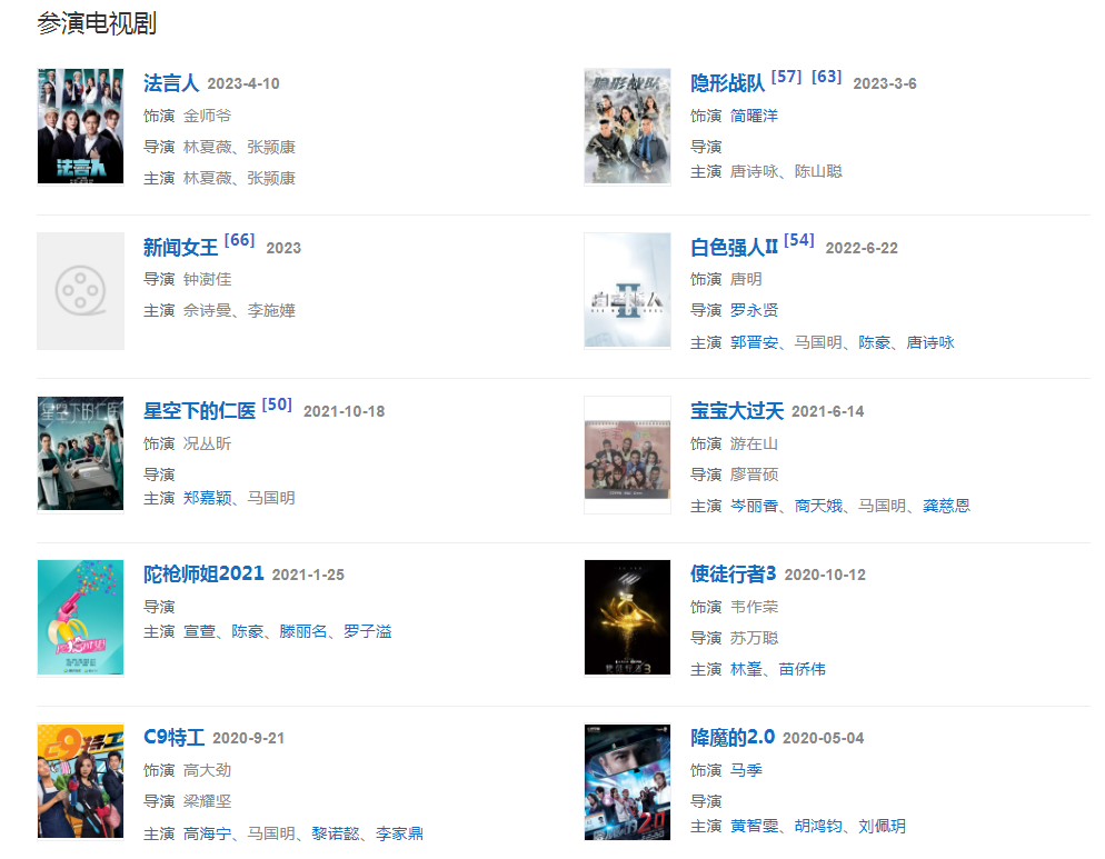 代表作品:降魔的、白色強人、On Call 36小時、飛虎之雷霆極戰(zhàn)、律政新人王Ⅱ